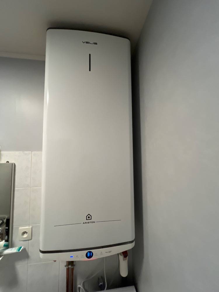 - L’installation d’un nouveau chauffe-eau extra-plat et plus performant Ariston Velis Evo, adapté aux besoins du foyer.