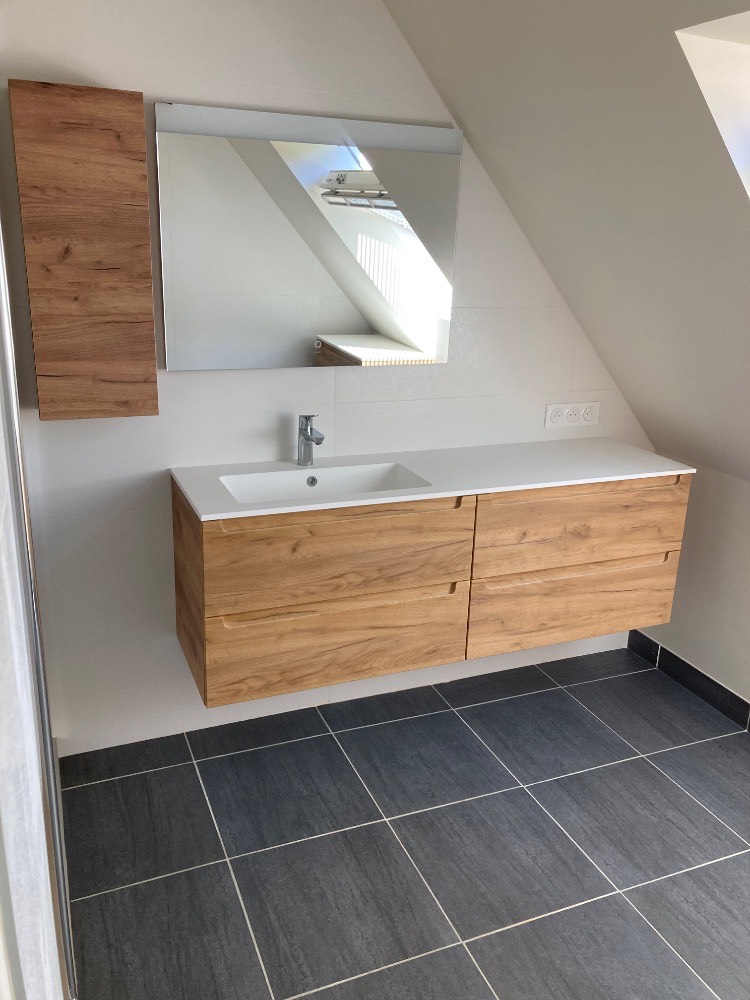 - Un meuble de salle de bain avec vasque intégrée, offrant des rangements pratiques et une meilleure organisation de l’espace.