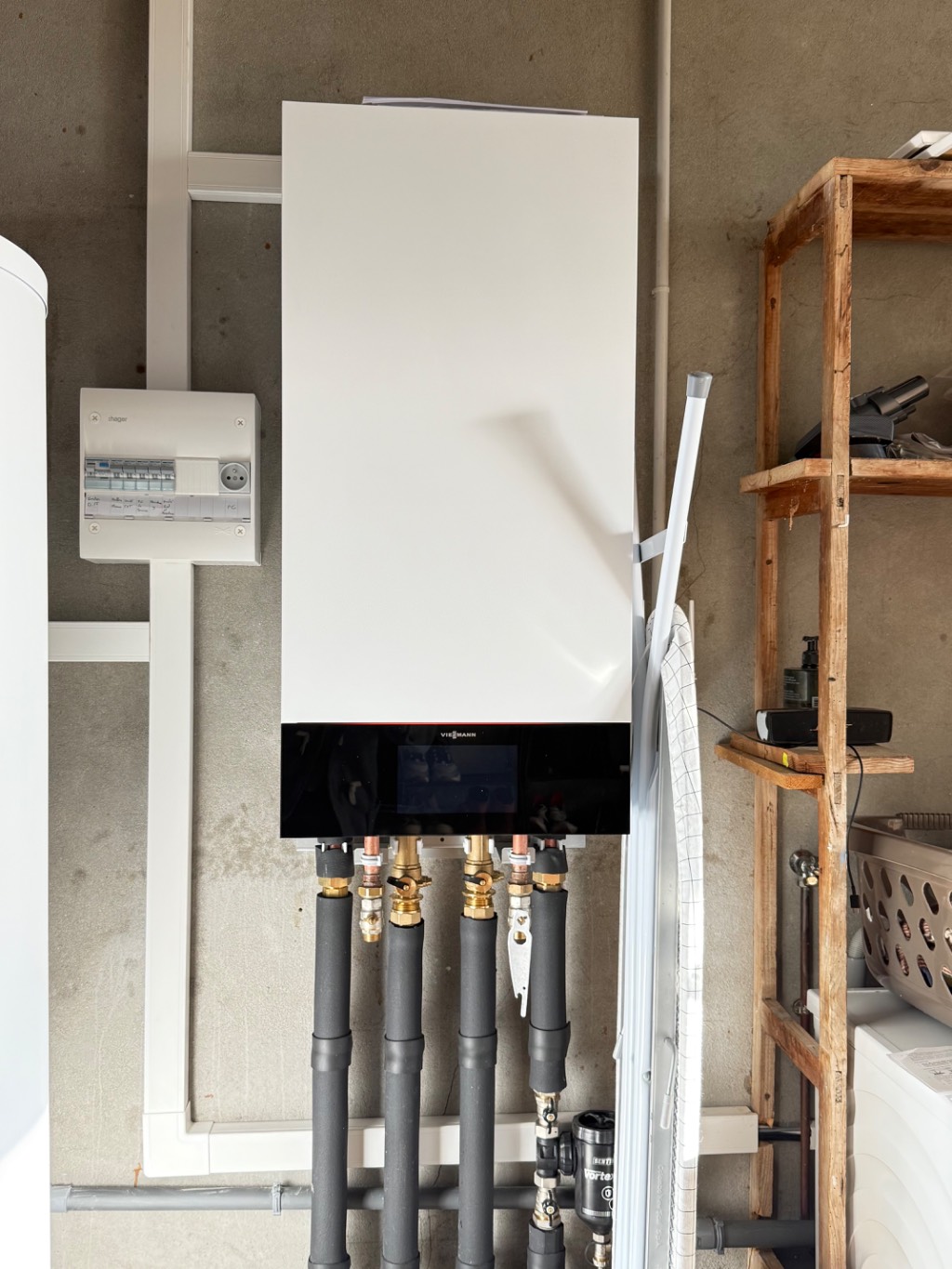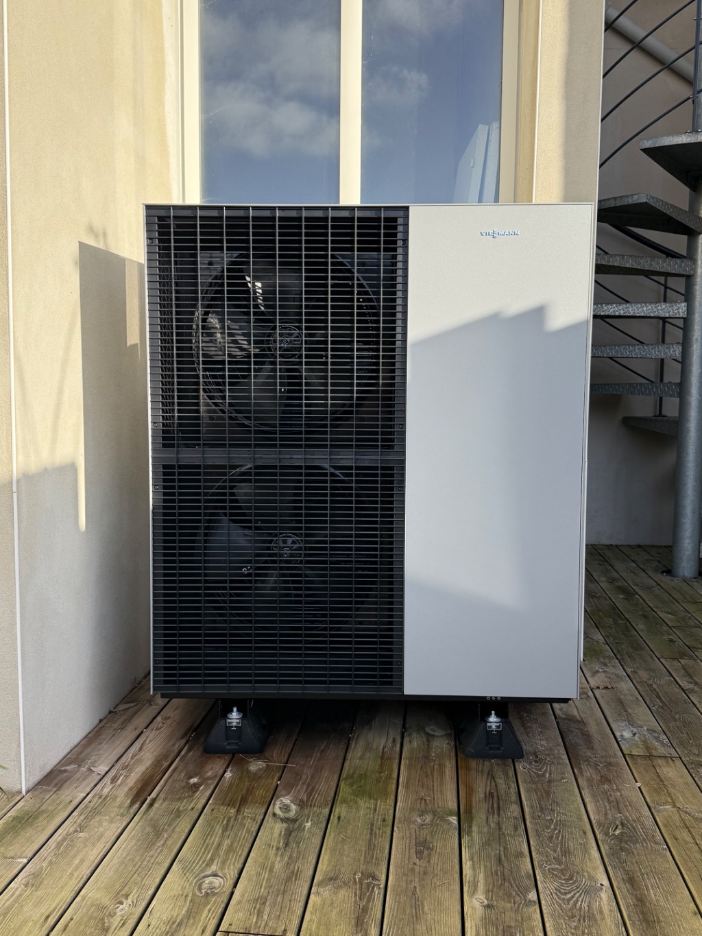 Pour répondre aux besoins du foyer, un chauffe-eau thermodynamique Viessmann a été installé. Ce système fonctionne sur le principe de la pompe à chaleur en récupérant les calories présentes dans l’air afin de chauffer l’eau, permettant ainsi de réduire significativement la consommation d’électricité par rapport à un chauffe-eau classique.